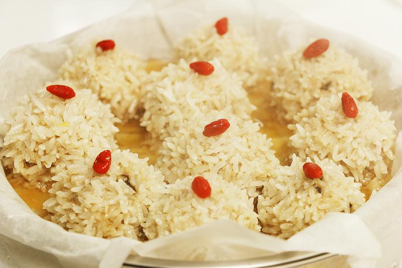 長糯米洗淨泡水3小時後瀝乾,乾香菇泡熱水切碎,蔥和薑切末,枸杞泡熱水備用。