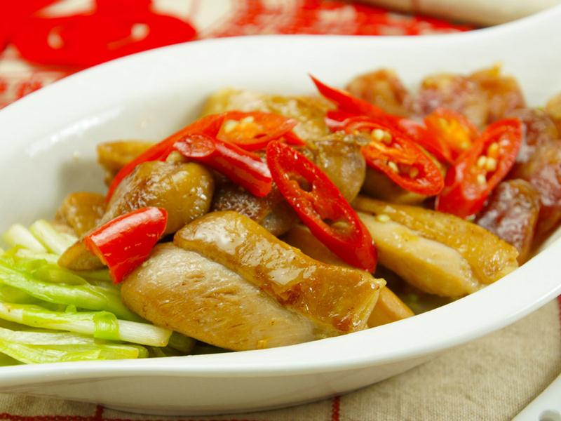 廣式臘腸搭配燒雞的組合,就是最佳下飯料理啦。臘腸可以換成香腸;雞肉用拜拜剩下的白斬雞、烤雞替代也沒問題,只要把醃料改成最後一個拌炒步驟加入即可。台灣人常常有祭祀的活動,這個食譜最適合拜拜後當作收尾的料理,不會浪費食材又可變化口味,值得一試!