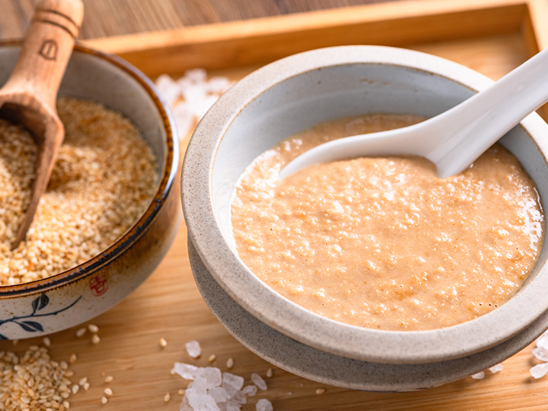 以白芝麻為基底,加入醬油、烏醋與蒜頭打勻,口感濃稠滑順,帶有鹹香微酸的清爽風味。利用隨行研磨機快速混合乳化,比例穩定,不易油水分離。適合搭配涼麵、雞絲、燙青菜或涼拌料理,夏天吃特別開胃清爽。