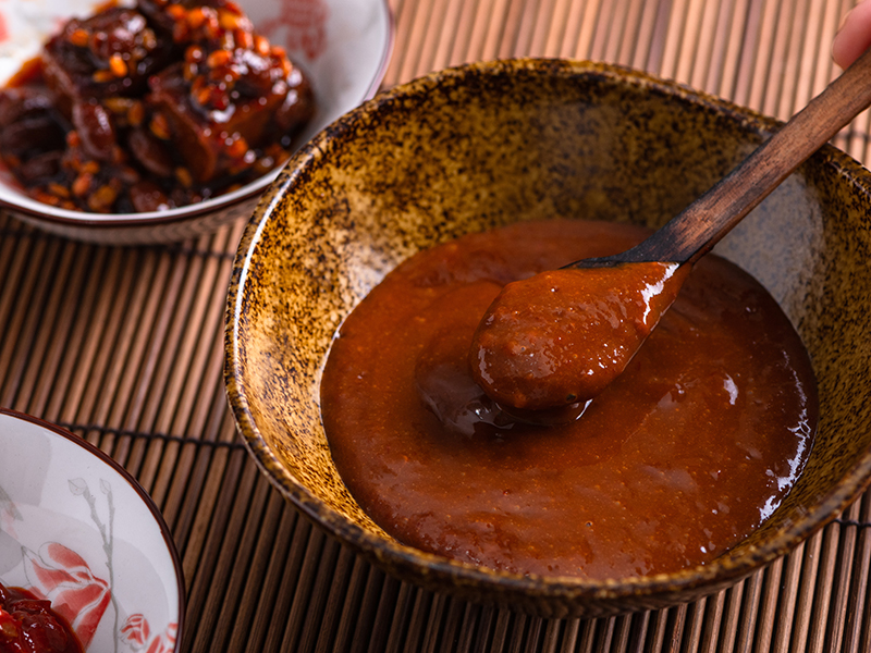 以豆瓣醬、豆腐乳、蒜頭與醬油製作,風味濃厚鹹香帶微辣、口感濃稠,透過研磨機快速混合,讓醬料更細緻均勻。適合搭配羊肉爐、火鍋肉片或燙青菜,增添層次與暖身風味,是火鍋必備沾醬。