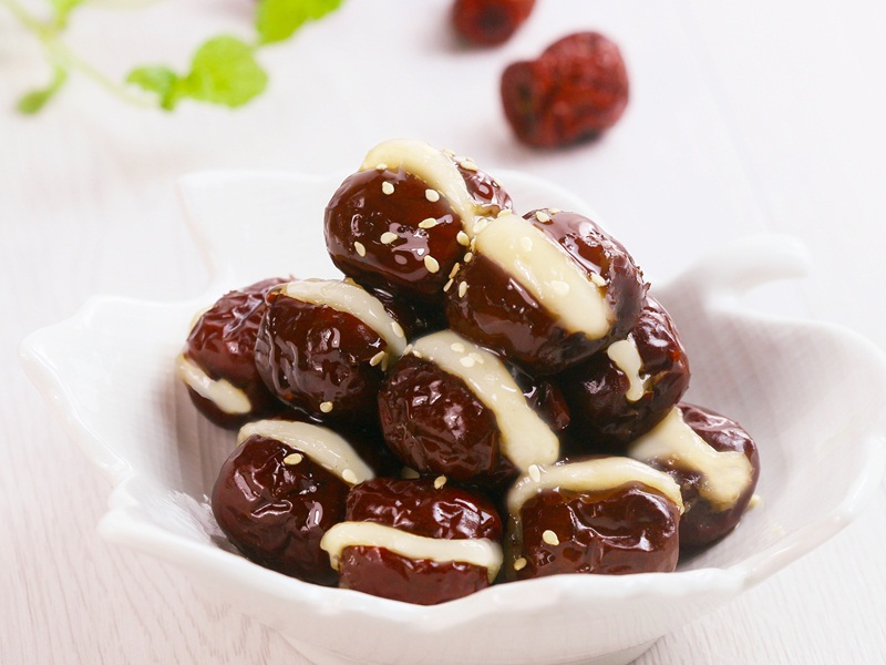 將去籽紅棗剖開,將糯米糰切分成30個,搓成條狀填入紅棗中。