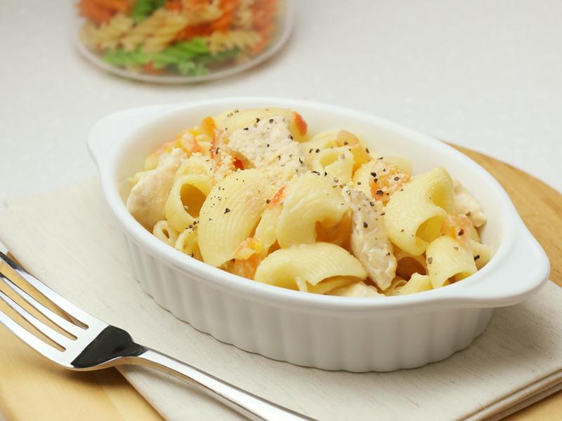 濃郁的白醬是義大利麵極受歡迎的口味,味道溫和連小朋友都很喜歡。這道食譜做了一點小變化,鮮奶油濃郁香醇的口感,再加上酸甜的番茄,降低了白醬的膩口感。這個食譜是一鍋到底的做法,濃稠的醬汁搭配粗的彎管麵,才不會沾取過多的醬汁。