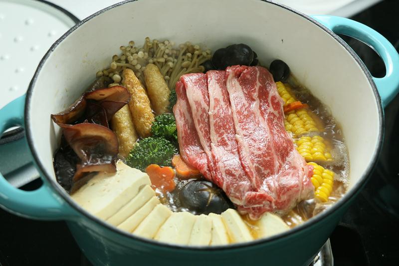 放入壽喜燒醬汁、水、大白菜煮至沸騰,蓋上鍋蓋續煮10分鐘,熄火續燜5分鐘。