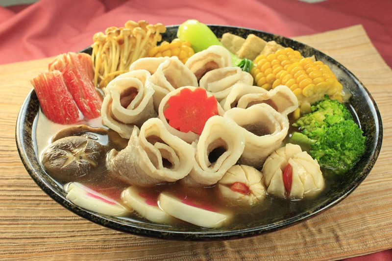 大白菜整顆切大塊狀,豬五花肉片切塊狀,洋蔥切絲,金針菇洗淨切段,鮮香菇去蒂切十字,豆腐切片,玉米切段,蒜苗切斜片。