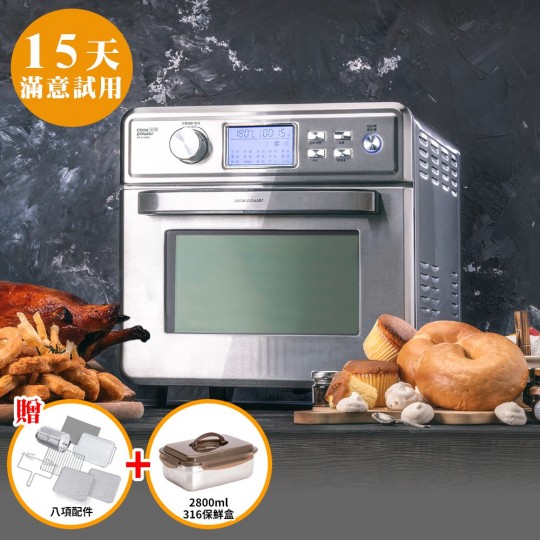 瀝油不沾烤盤超萬用,烤全魚免翻面、超不沾。 超大容量+多層烘烤,4斤全雞、烤全鴨都OK。 微電腦16種烹飪模式,簡單易操作。 上下電熱管+TURBO氣旋,烘烤快速均勻。 烤箱+氣炸鍋+燉鍋+果乾機+燒烤爐+麵包機,六機合一。 多樣配件料理真輕鬆,滿足中西各種烹調方式。 少油氣炸、告別油煙油膩、減油80%更健康。 可視雙層玻璃門,隨時掌控食物熟度與美味。 5大安全裝置,使用安全又安心。