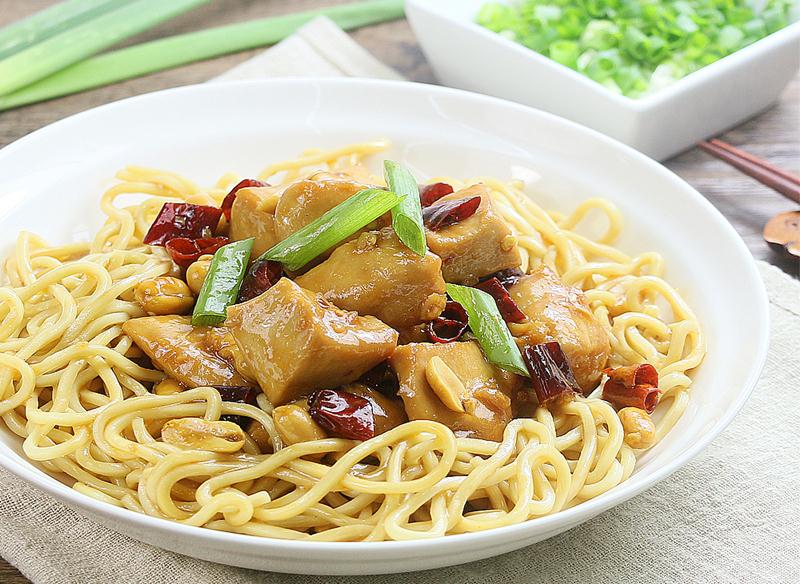 宮保雞是丁四川名菜,特色就是乾辣椒與花生米。用大火把豔紅的乾辣椒煸得香氣四溢,收尾時再撒入香脆的花生米,大火過油的雞丁軟嫩,多層次的口感,香、 辣、麻三味一體,絕對是最佳搶飯料理!這份食譜搭配油麵來享用,麵條裹上宮保濃郁的芡汁,保證一口接著一口!
