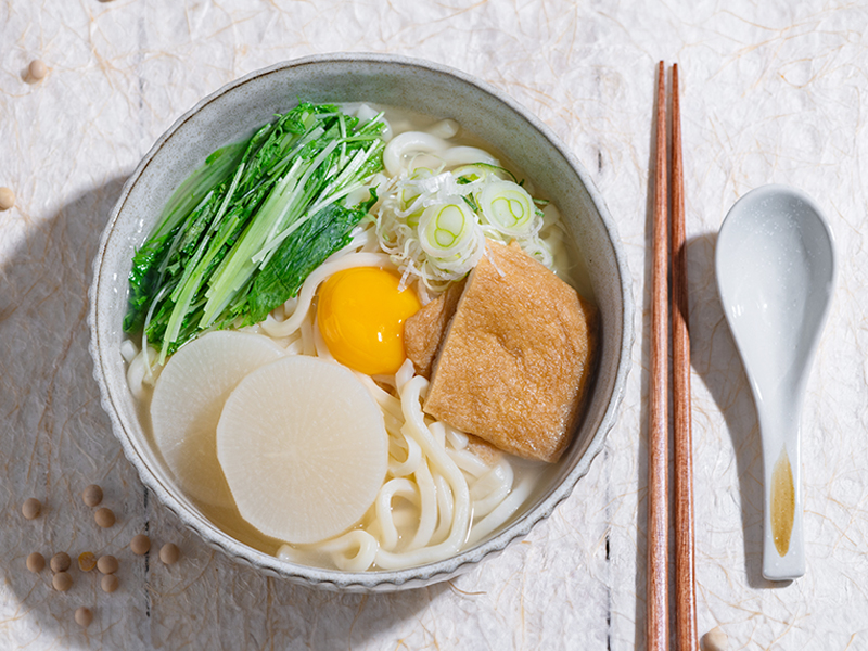 最後將烏龍麵、配料、高湯組裝在一起即可享用。