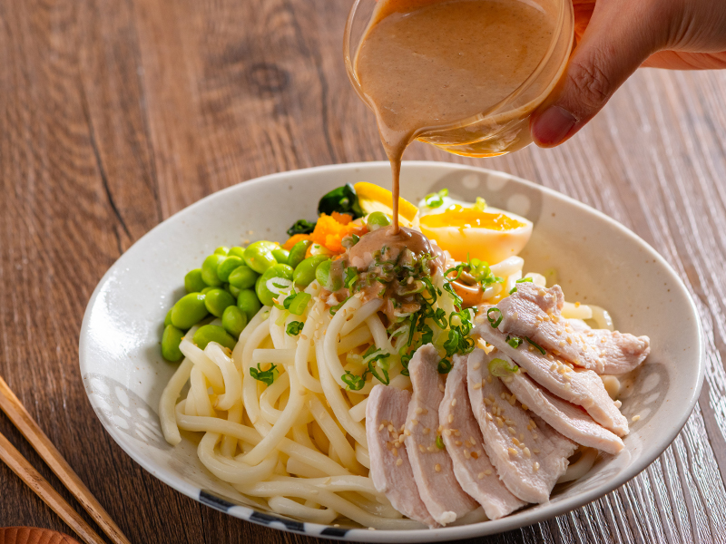 烏龍麵加入調味料和自製胡麻醬7大匙,依個人喜好加入配料,拌勻後即可享用。