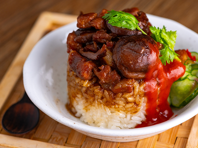 待電鍋跳起後取出蒸盤和小內鍋,留糯米再燜10分鐘,接著加入麻油和油蔥酥拌勻。最後把滷肉和糯米填入容器塑形,脫模後即可享用。