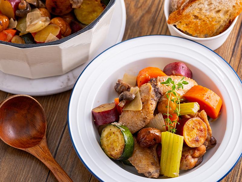 加入煎好的雞翅、地瓜、櫛瓜,續加入雞高湯、蘋果醋、百里香、栗子煮沸後小火燉20–25 分鐘,直到地瓜軟化、湯汁略收乾。