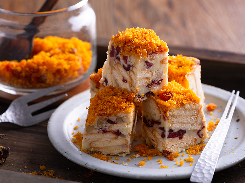 拌勻後倒入模型中將表面壓平,趁熱在表面撒上烏魚子跟鹹蛋黃碎,稍微加壓讓食材黏在表面。