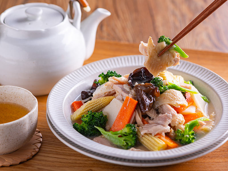 準備一台電鍋,配料放上蒸盤,雞肉放入內鍋並加水淹過雞肉,外鍋加 1 杯水,放入蒸架、內鍋和蒸盤,按下開關,6-10分鐘後先取出配料,最後待電鍋跳起雞肉再燜 5 分鐘。