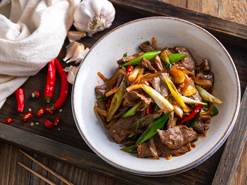 原鍋加1小匙油,爆香蔥白、洋蔥、蒜頭、辣椒,接著牛肉回鍋,加入所有調味料,大火翻10–15 秒。