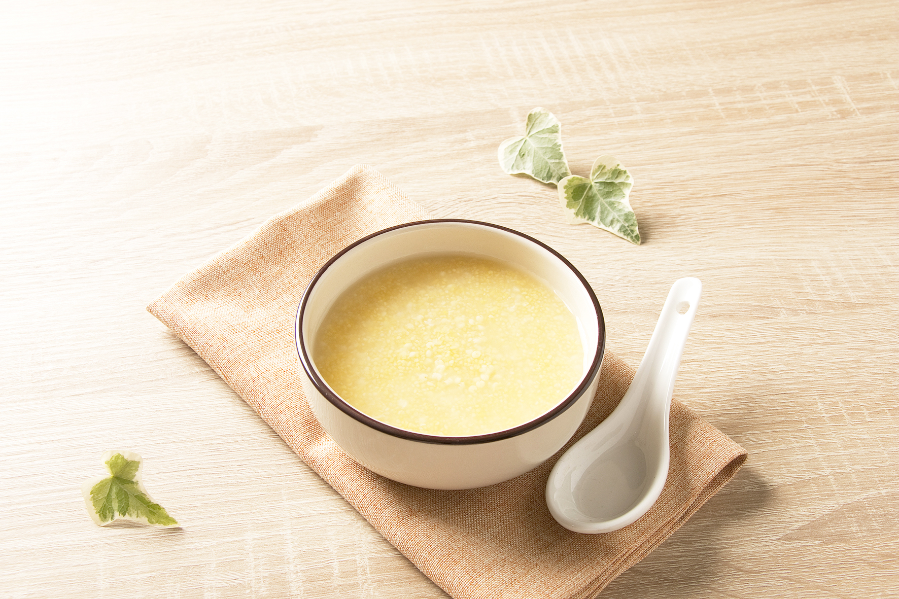 小米慢熬成金黃色粥品,口感細緻柔滑、清爽易入口,帶有淡淡穀香。小米富含維生素B群與礦物質,有助養胃、促進消化,適合各年齡層日常食用。