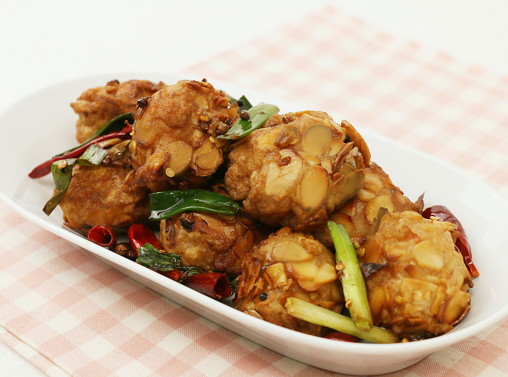 炸好的杏仁蝦球不炒宮保醬直接吃也很美味,製作蝦球時,要注意蝦球若捏得得太大不容易炸透,目測約五十元硬幣大小即可,半斤蝦泥可製作15個蝦球,最後沾裹杏仁片時可以輕輕按壓,讓杏仁片附著在蝦球上不易散落。