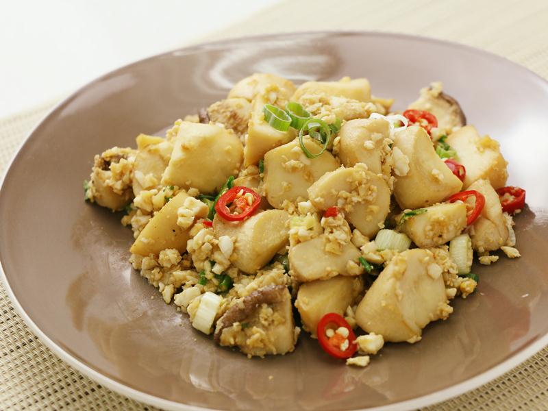 炒鍋以小火續放沙拉油,將蒜末爆香,加入蛋黃炒至起泡,再加入蛋白、杏鮑菇,撒上蔥花、辣椒,加入調味料,即可盛盤享用。