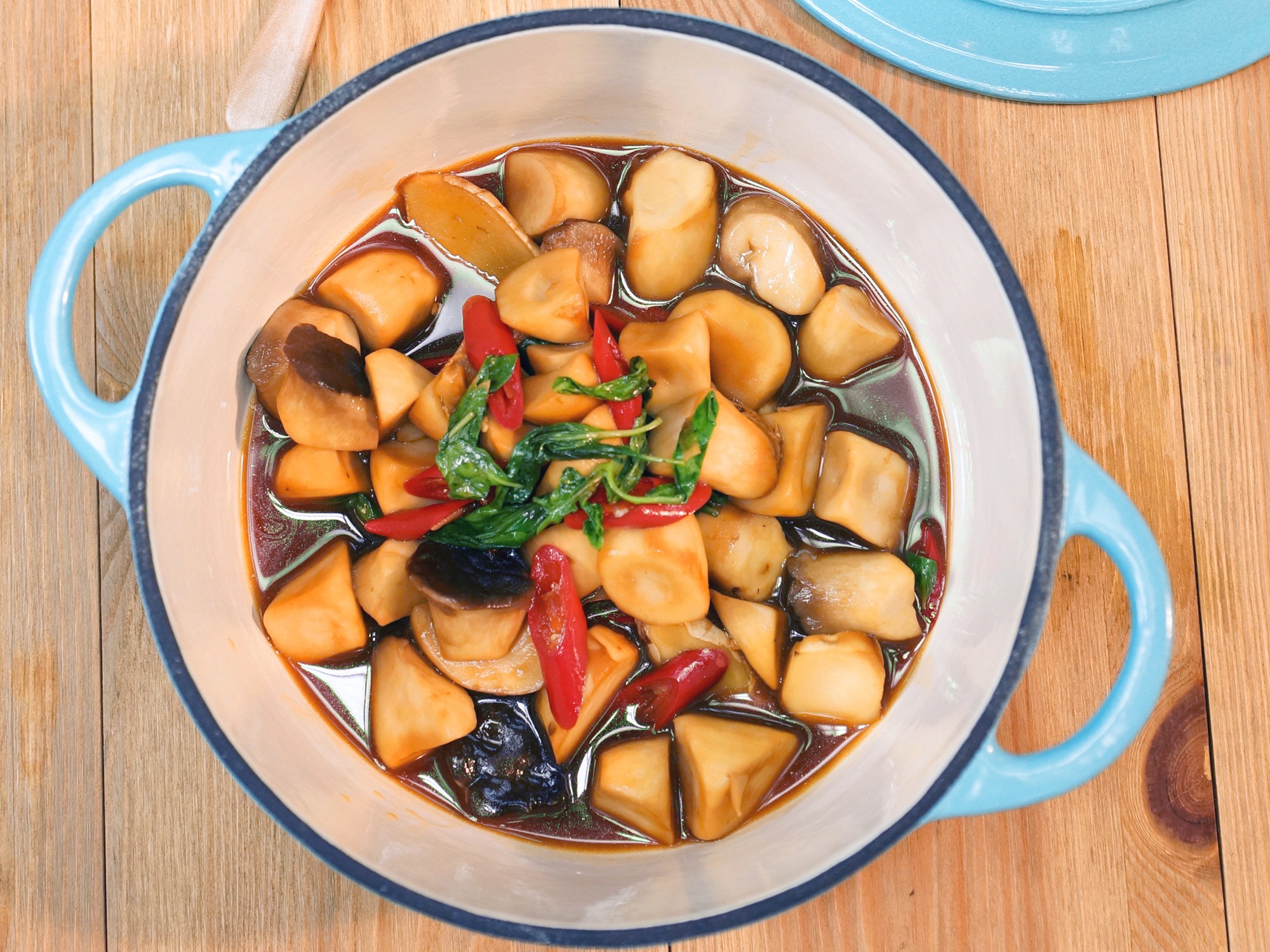 6  再加入米酒、糖、醬油膏、水拌炒後以小火燜煮至稍收汁。
