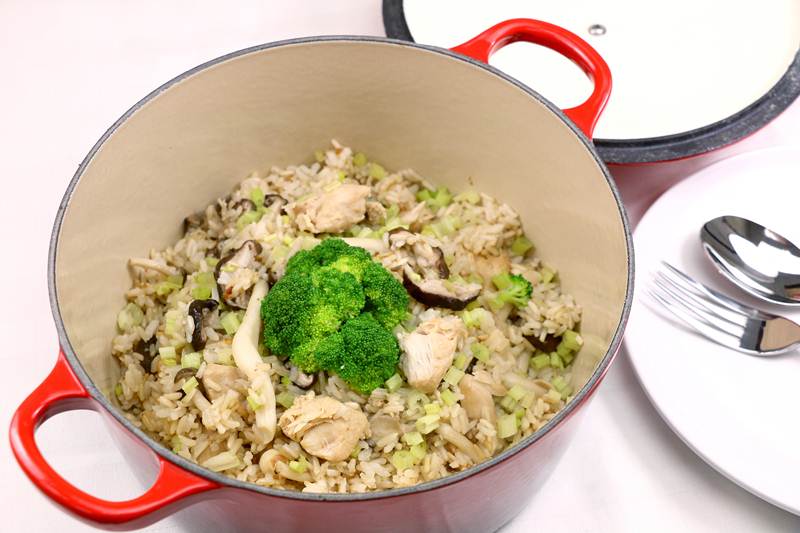 將糙米及白米洗淨,泡水浸泡20分鐘;醃料攪拌均勻,雞胸肉切小塊,拌入醃料,醃15分鐘;鮮香菇切絲。秀珍菇、鴻喜菇去蒂頭後洗淨;芹菜去葉、洗淨、切末;花椰菜洗淨、去粗皮,汆燙備用。