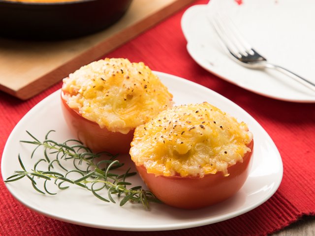 將薯泥填入番茄容器裡,上方鋪上乳酪絲,放入烤箱,烤至上色取出。