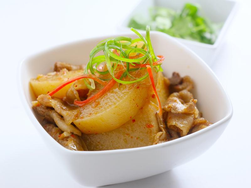 這是一道常見的韓式常備菜,在韓國料理餐廳很常見。白蘿蔔有膳食纖維,能夠促進新陳代謝,而且白蘿蔔可以保存較久的時間,不易腐壞。若不加入豬肉的話,單純料理白蘿蔔,可存放在冰箱較久的時間,當作常備的小菜食用。