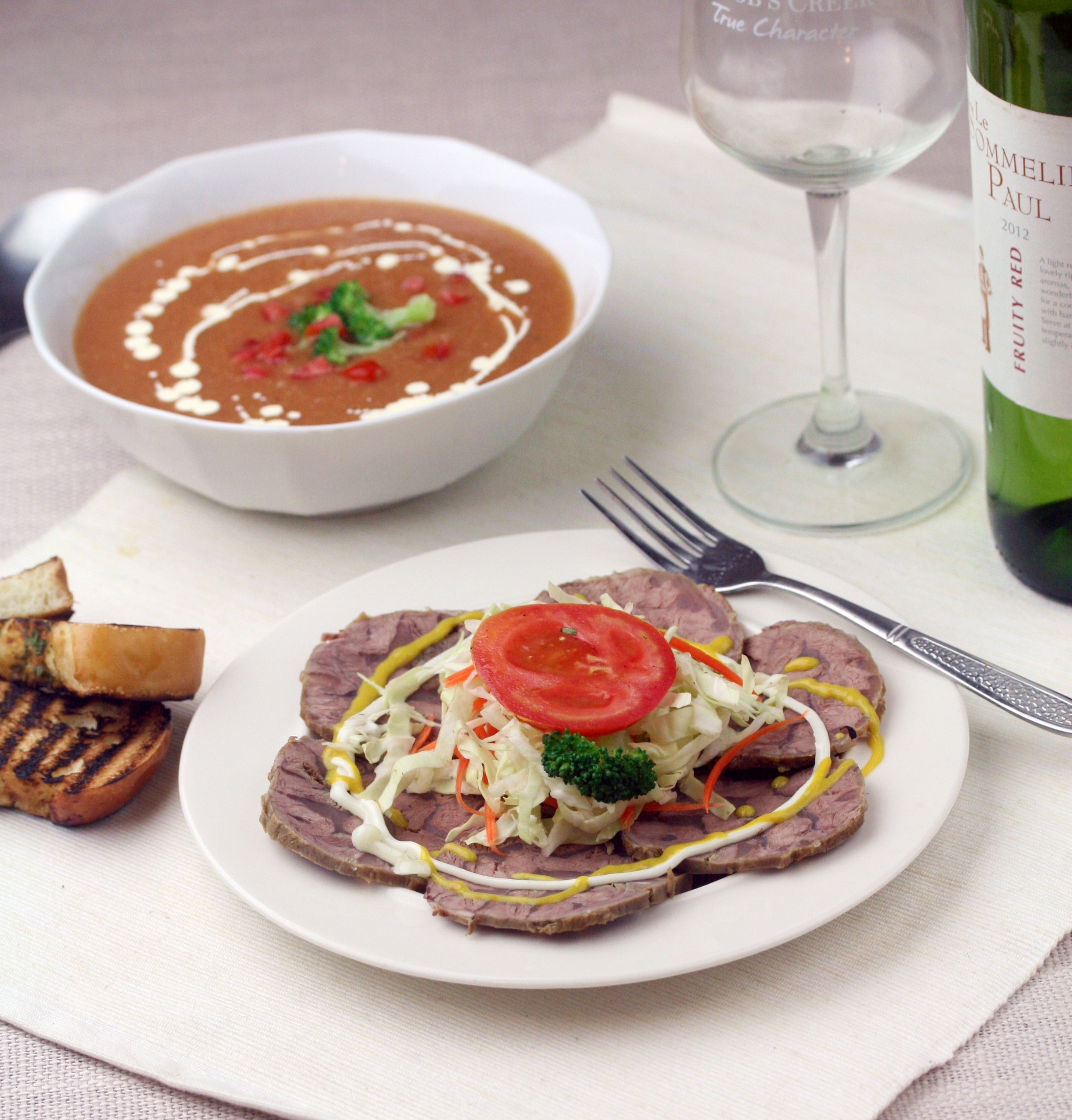 麵包切片烤過,即可和湯,肉片一起上桌。