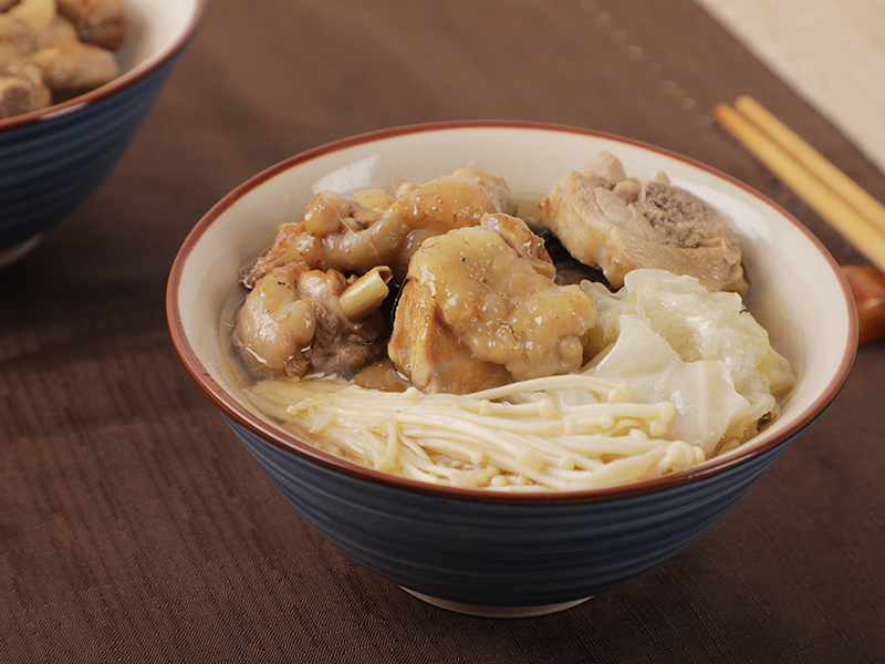 取一電鍋內鍋將雞腿塊、高麗菜片、金針菇、大蒜及肉骨茶包和水放入,外鍋放入1杯。