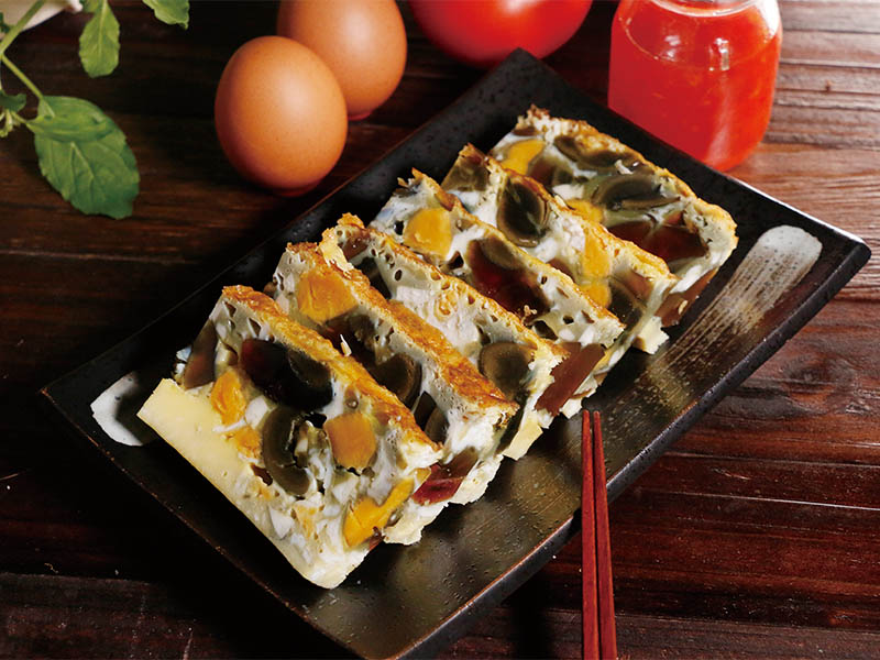 金黃色討喜的三色蛋,是簡易好做的年菜。利用雞蛋、皮蛋、鹹蛋等三種不同層次口味的蛋類,mix在一起,成為三種疊加的獨特風味。利用氣炸鍋代替傳統電鍋蒸法,可使蛋液層次分明、口感更加清爽,鹹蛋白與蛋黃分開的做法更可使成品不過鹹,一定要試試!