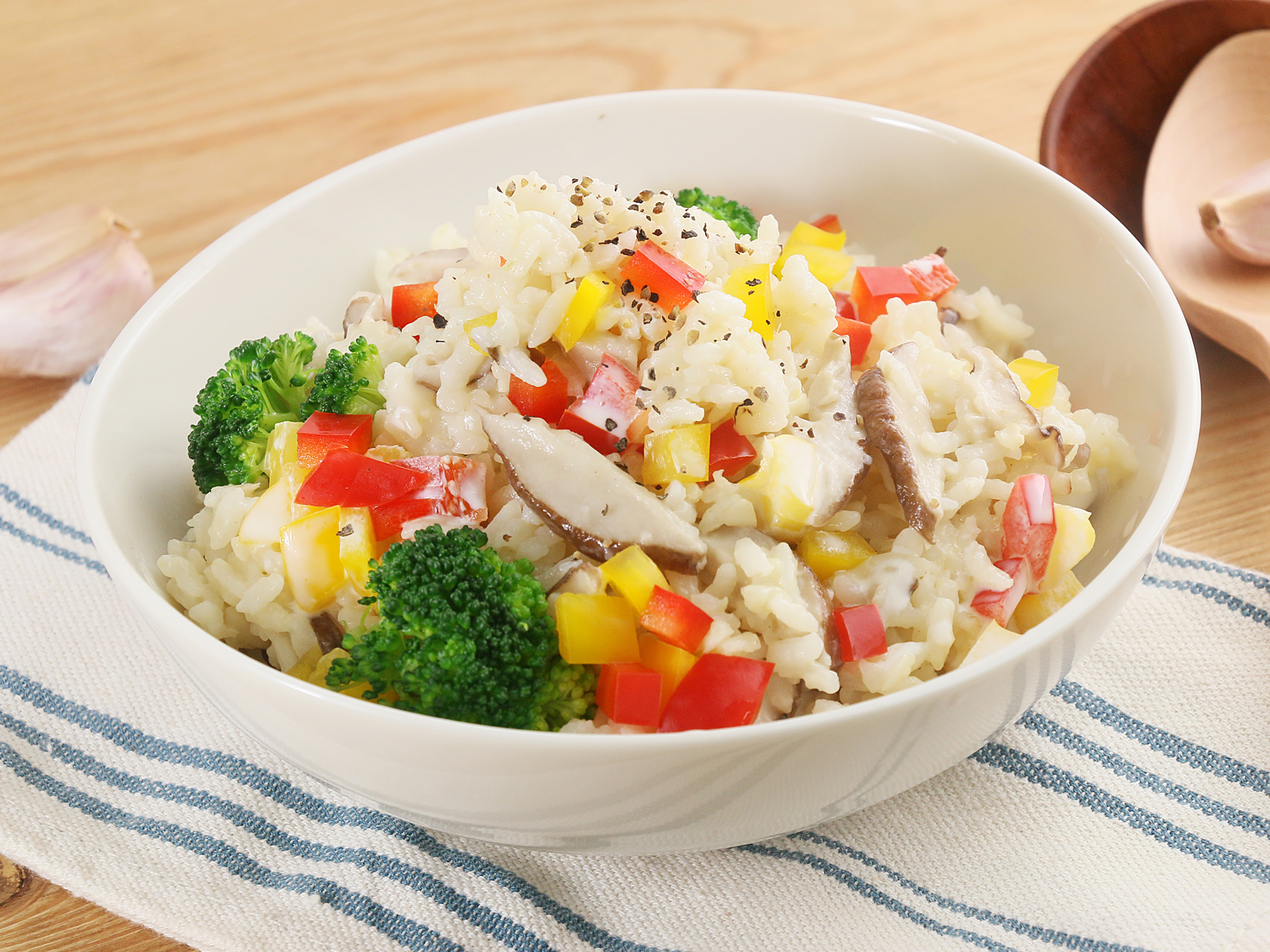 Risotto是義大利相當經典的調味飯,用高湯將米煮熟,米粒吸收高湯的鮮甜精華,煮成奶油般濃郁質地的料理。這份食譜濃濃奶香加上鮮香菇的蕈香味,讓人每一口飯都充滿大地的香氣,喜歡有口感有咬勁的人,可以將白飯換成義大利燉飯蒸成的米飯。