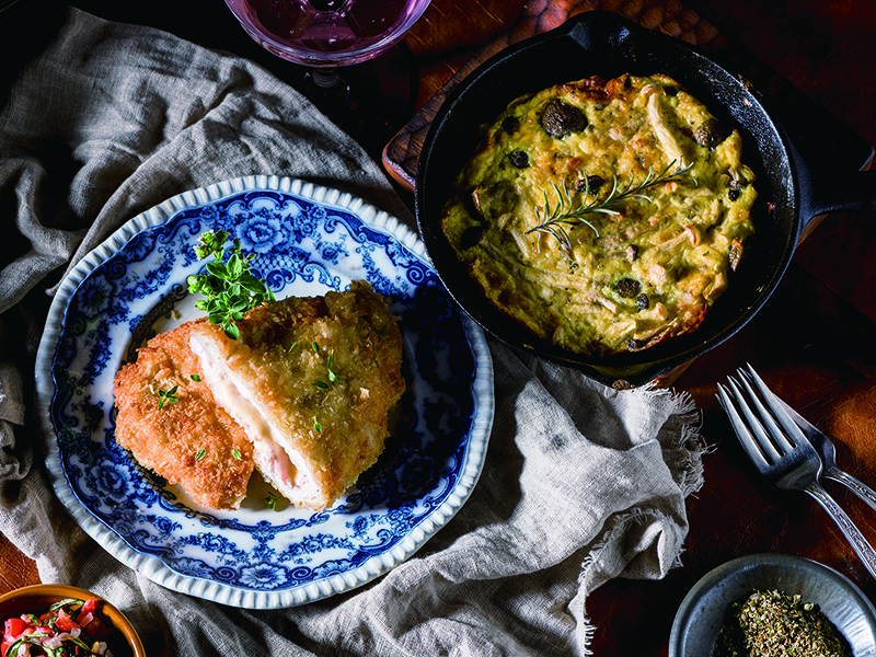 將火腿、起司片依序放在醃好的肉排上對折,分別沾上一層薄麵粉,再沾上蛋液及麵包粉。