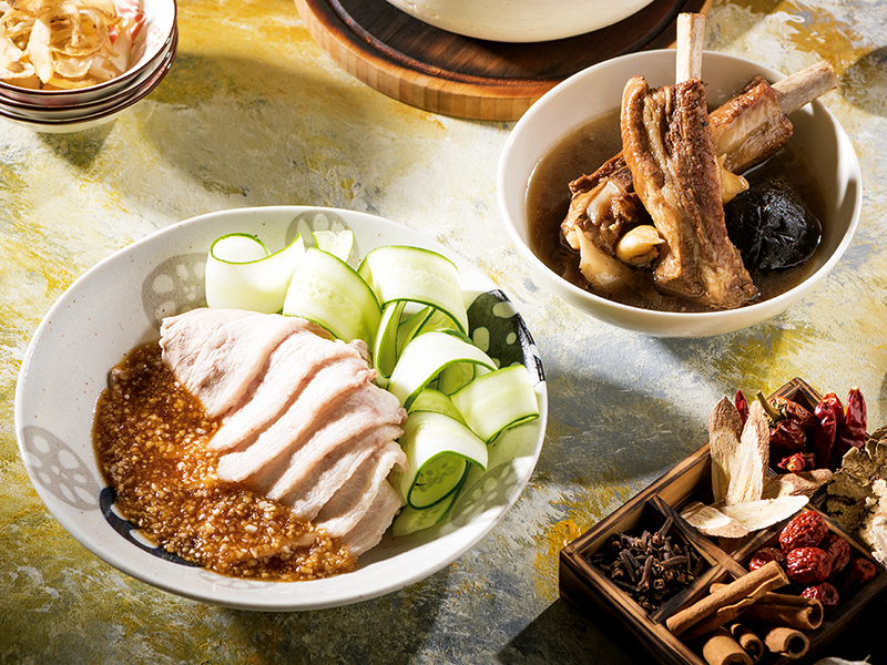待開關跳起,五花肉取出切薄片淋上蒜泥醬;肉骨茶加入調味料拌勻即可。