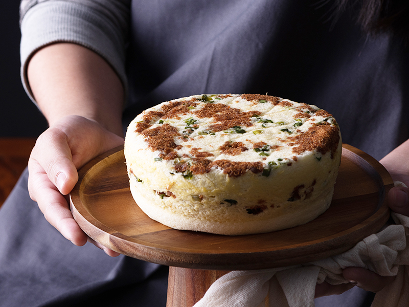 拿一個6吋蛋糕模鋪上烤盤紙,倒入1/2的麵糊,撒上一半的蔥花、肉鬆,再倒入剩下1/2的麵糊,最後把剩下的蔥花跟肉鬆撒上表面。