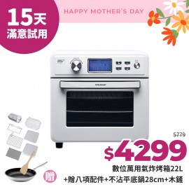瀝油不沾烤盤超萬用,烤全魚免翻面、超不沾。 超大容量+多層烘烤,4斤全雞、烤全鴨都OK。 微電腦16種烹飪模式,簡單易操作。 上下電熱管+TURBO氣旋,烘烤快速均勻。 烤箱+氣炸鍋+燉鍋+果乾機+燒烤爐+麵包機,六機合一。 多樣配件料理真輕鬆,滿足中西各種烹調方式。 少油氣炸、告別油煙油膩、減油80%更健康。 可視雙層玻璃門,隨時掌控食物熟度與美味。 5大安全裝置,使用安全又安心。