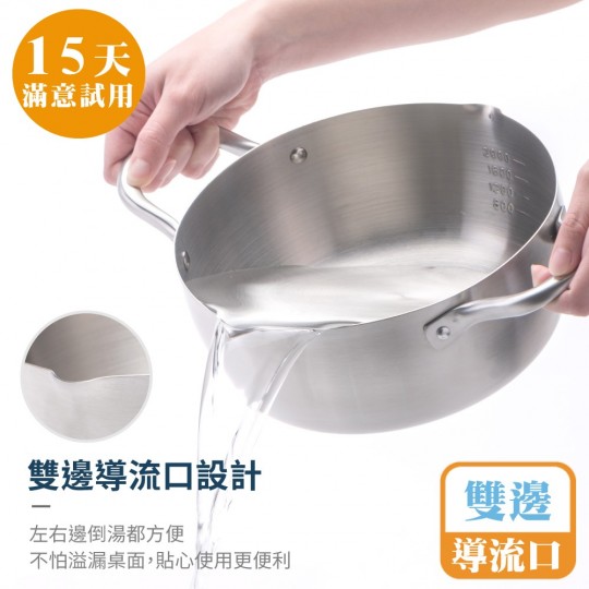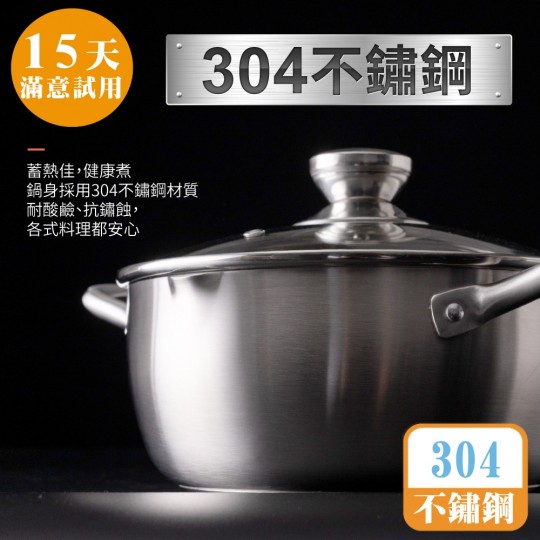 304不鏽鋼,耐酸鹼、抗鏽蝕,蓄熱佳 導磁複合金鍋底傳熱快速、導熱均勻,適用電磁爐 雙邊導流口設計,左右邊倒湯都方便,不怕溢漏到桌面 透明強化玻璃蓋,烹調好掌握,易於掌握食材熟度與美味 歐式造型經典演繹,外層細緻拋光,美觀大方 中空 手把設計,有效減少熱傳導