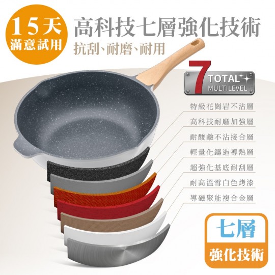 七層強化不沾,花崗岩般堅硬、抗刮、耐磨