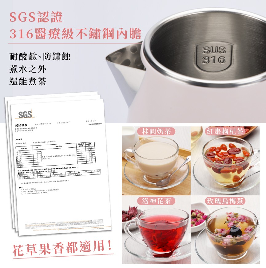 316醫療級不鏽鋼內膽,煮水、泡茶更安心。