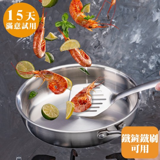 不鏽鋼材質打造,帶殼海鮮也能盡情翻炒,鐵鏟、鐵刷都適用。