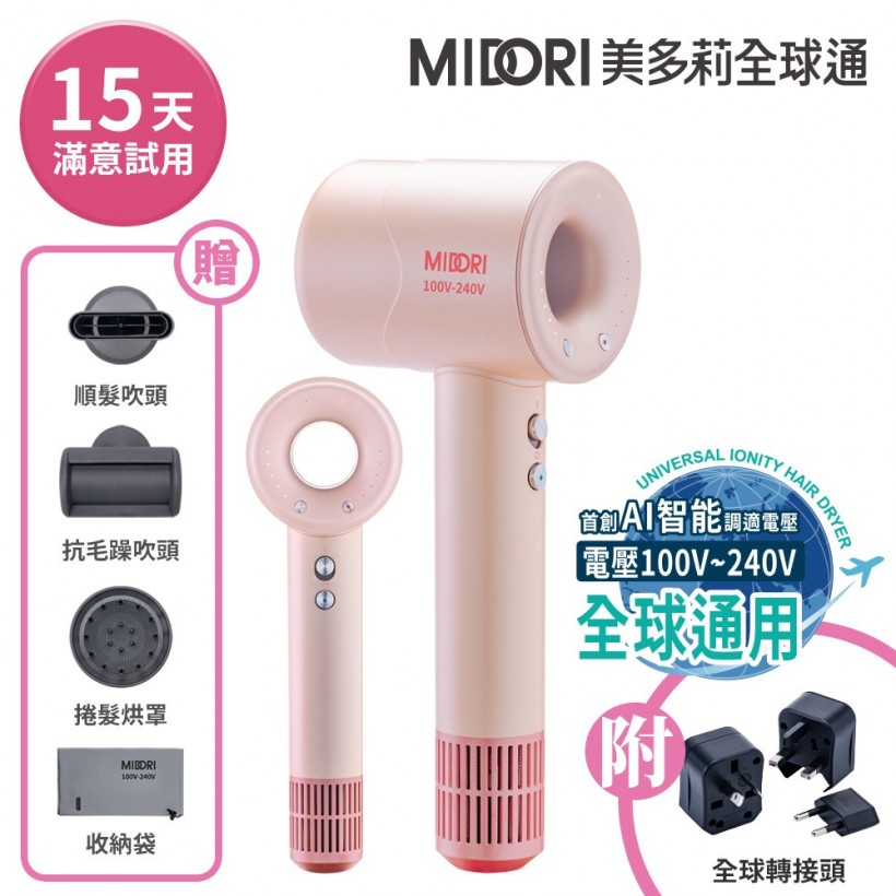[MIDORI美多莉全球通]高風速溫控負離子吹風機-櫻花粉(附全球轉接頭)+贈順髮吹頭+捲髮烘罩+抗毛躁吹頭+收納袋