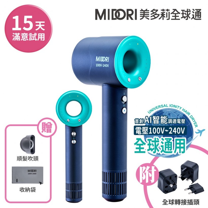 [MIDORI美多莉全球通]高風速溫控負離子吹風機-鍺藍色(附全球轉接頭)+贈順髮吹頭+收納袋