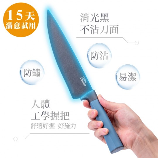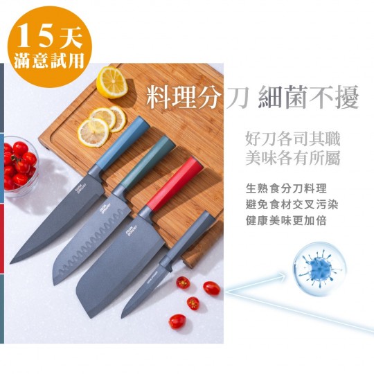 廚房必備刀具組合,生熟食分刀料理更衛生。 高科技熱處理+不沾精工製造,鋒利持久。 消光黑不沾刀面,防沾/防鏽/易潔。 人體工學握把,輕巧不滑手。
