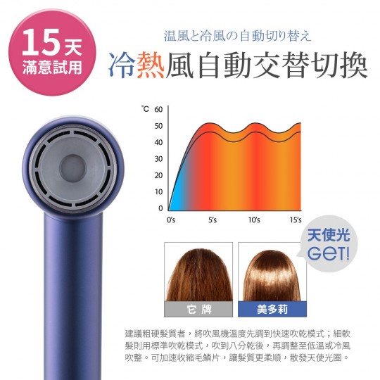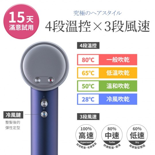 110000rpm,Hypersonic數位馬達氣流倍增科技 3段風速+4段溫控,整髮/造型得心應手 NTC智慧溫控,每秒100次偵測並控制溫度 360°磁吸式旋轉吹頭,輕鬆吸附 300g輕量美學,旅行好攜帶
