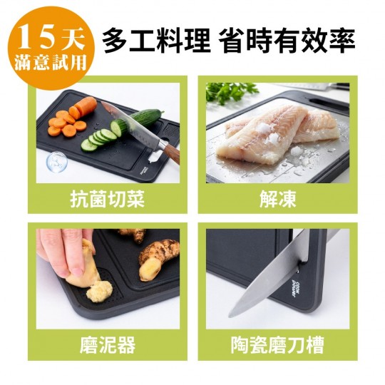 表面磨砂處理,防滑刀及彈刀。 防沾解凍板,快速解凍食材。 附磨刀槽,刀具保養不費力。 貼心研磨區,蒜泥/薑末OK。 防溢凹槽設計,不弄濕桌面。 四邊防滑邊條,穩固抗震。 便攜提把,可壁掛收納。