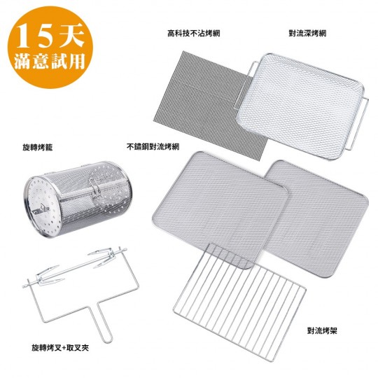 附件:說明書x1、瀝油不沾烤盤x1、不沾深烤盤x1、不沾接油盤x1、不鏽鋼烤網×1